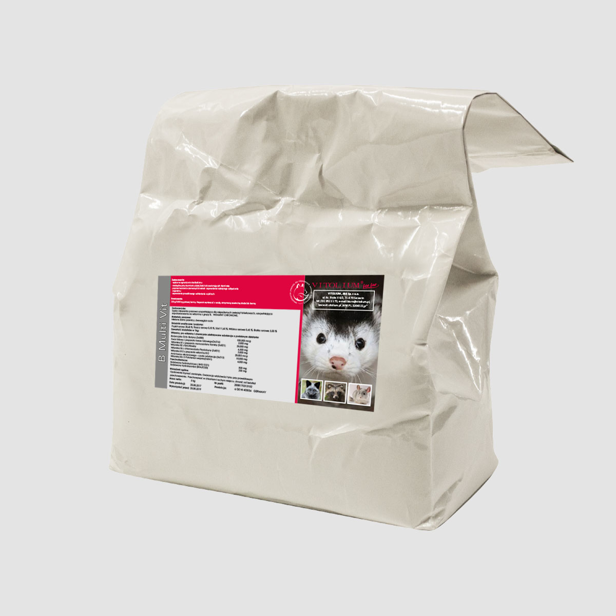 - Preparat wzbogacony w wyższe dawki witamin niezbędnych dla mięsożernych zwierząt futerkowych.